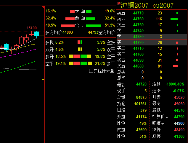早间铜价低开主因受OPEC+延产的不确定性影响,油价表现动荡,拖累铜价。另外近期中美关系日趋紧张,美国商务部表示将对 33 家中国机构实行限制措施,地缘政治风险扩大加重了市场的担忧情绪,压制铜价上行。基本面变化不大。今日沪铜主力早间开于44710元/吨,开盘后多头减仓施压铜价,盘面短暂下滑至44660元/吨,小幅反弹后,自44750元/吨位置震荡下行约100元/吨,午盘收于44640元/吨。午后开盘铜价短线下跌,探日内最低点44570元/吨,而后空平多入支撑铜价转跌为升,最高攀至44780元/吨,临近收盘作小幅调整,最终收于44720元/吨,跌180元/吨,跌幅0.40%。今日沪铜主力合约日内减仓379手,至10.1万手,主要表现为多头减仓;成交量减少0.7万手,至8.5万手;沪铜指数日内减仓5203手,至31.9万手,主要表现为多头减仓;成交量减少0.1万手,至18.8万手。今日沪铜主力整体围绕44700元/吨一线附近波动。