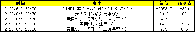 美国5月季调后非农就业人口变动(万)、美国5月劳动参与率(%)、美国5月平均每小时工资月率(%)、美国5月失业率(%)、美国5月平均每小时工资年率(%):