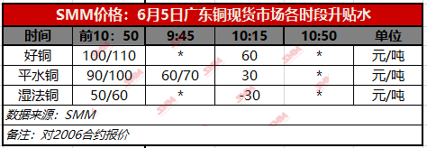 【SMM价格】6月5日广东铜现货市场各时段升贴水(第二时段)