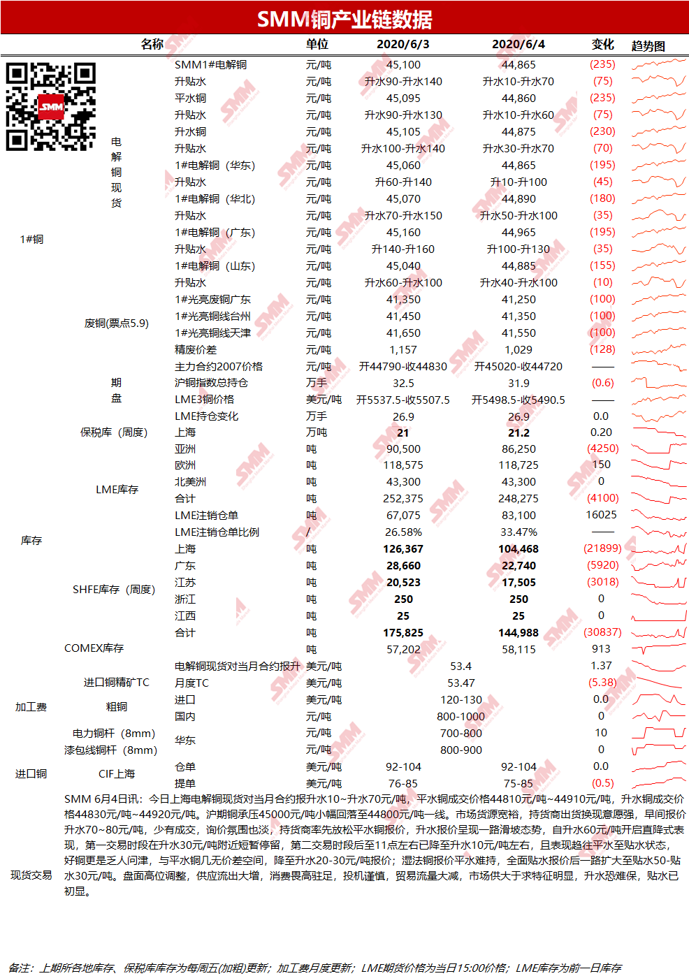 6月4日LME铜库存环比减4100吨至248275吨;上期所铜仓单库存环比减481吨至44059吨。