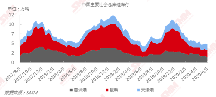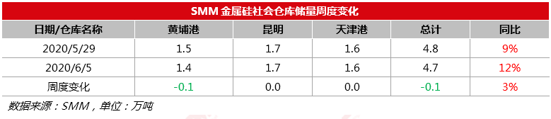 2020年6月5日:SMM统计金属硅三地社会库存共计4.7万吨,较上周减少0.1万吨。港口库存维持去化,因订单较少贸易商采购意愿不足仍以消化存货为主。下周开始云南四川两省复产产能将开始释放产量,从稳定出货到运送至港口尚需时间,预计从本月下旬社会库存将出现上升拐点。