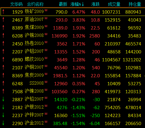 黑色系方面,铁矿涨近6.3%,焦煤涨近1.8%,热卷涨近1.6%,螺纹涨近1.2%,焦炭涨近0.1%,不锈钢涨近0.4%,从近期钢铁去库速度看,季节性淡季逐渐来临,库存减量不及前期但绝对量仍远高于往年同期,说明下游需求好于往年。而铁矿部分商家仍对近期市场相对乐观,大幅降价出货意愿不高。钢厂对于铁矿刚需继续维持高位,对于铁矿价格仍存较强支撑;但考虑到本周部分港口进口矿库存有望环比增加,对于矿价继续大涨亦有抑制,进口矿价格或延续反复震荡走势。短期内黑色系回调或未到位,但调整完毕后有继续上涨空间。