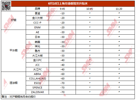 【SMM价格】6月10日上海市场铜现货升贴水(第一时段)
