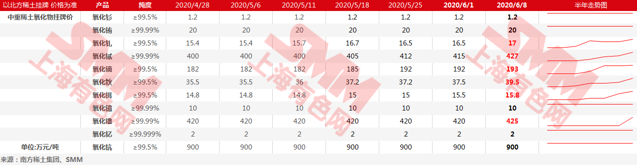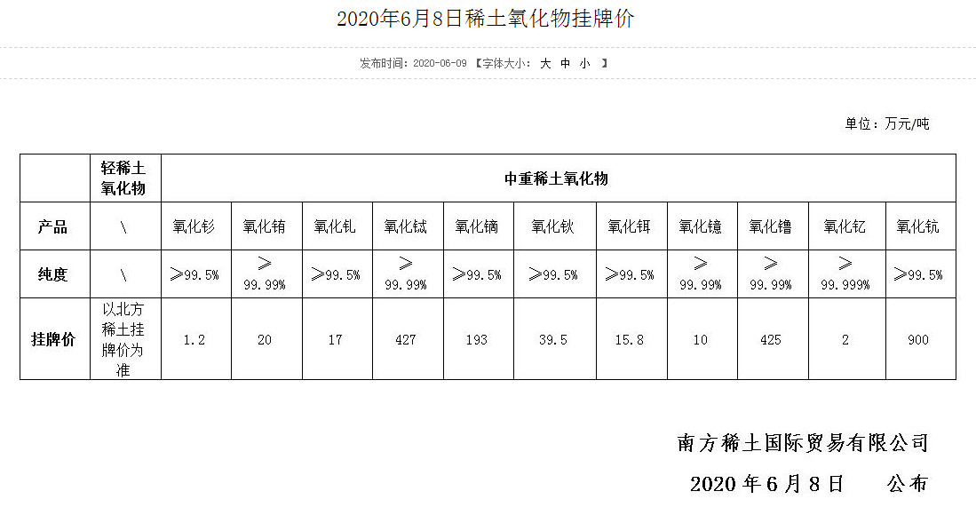 SMM6月10日讯:中国南方稀土集团南方稀土国际贸易有限公司公布最新中重稀土氧化物挂牌价格,多数氧化物价格上调。价格变动方面,氧化钬挂牌价39.5万元/吨,较上期上涨2万元/吨;氧化铽挂牌价427万元/吨,较上期上涨12万元/吨;氧化铒挂牌价15.8元/吨,较上期上涨0.3万元/吨;氧化钆挂牌价17万元/吨,较上期上涨0.5万元/吨;氧化镝挂牌价193万元/吨,较上期上涨1万元/吨;氧化镥挂牌价为425万元/吨,较上期上涨5万元/吨。此外仍有多个品种价格保持稳定,氧化钐挂牌价1.2万元/吨,氧化铕挂牌价20万元/吨,氧化镱挂牌价10万元/吨,氧化钇挂牌价为2万元/吨,氧化钪挂牌价为900万元/吨。