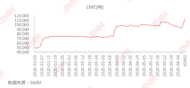 SMM6月10日讯:自5月20日以来,LME锌库存持续自高位回落,但目前LME锌库存结束降势,6月9日猛增8450吨后,今日延续昨日大增之势,继续猛增11450吨至113025吨,主要出自新奥尔良和巴尔的摩仓库。受库存拖累的影响,伦锌两日呈现下跌趋势,一度跌至1992美元/吨,截至16:30分暂报于1999美元/吨,跌幅为0.89%。