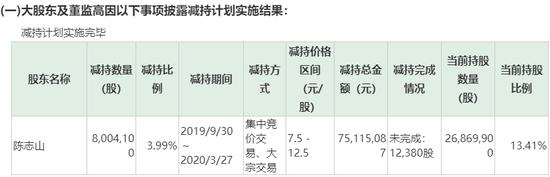 市值涨上去了,股东减持也同一时间完成了。公司总经理兼董事、第二大股东陈志山原本持有17%股份,减持完成后持有13.41%股份。2019年9月、12月,陈志山两次减持共计800.4万股公司股份,占总股本约4%。截止2020年1月1日,减持计划实施完毕,陈志山共减持所得约7511万元。