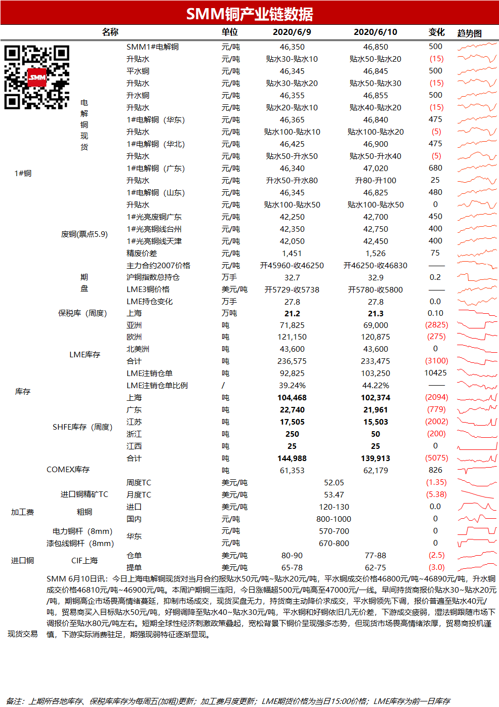 华南:6月10日广东1#电解铜现货对当月合约报升水80~100,较上一交易日涨25元/吨。现货市场,尽管铜价继续大涨,但广东库存仍在下降,持货商坚持挺价出货,临近换月仍有不少商家要交长单,因此只能被迫接受高升水,但下游点价不积极不高仍想拖到最后几天,总体成交一般。因预期到货紧张且刚需仍在预计今天升水还会小幅上升。