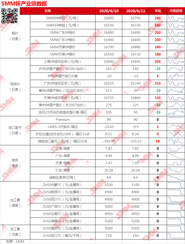 数据包括:锌现货报价、进口盈亏、库存、加工费