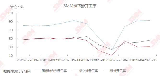 消费端,镀锌方面,据SMM调研,5月镀锌开工率为92.82%,环比上升0.7个百分点,同比上升14.42个百分点。由于近期黑色系价格走高,提振镀锌企业生产积极性,订单维持,但未有新的增长点。压铸锌合金方面,据SMM调研,压铸锌合金开工率为31.25%,环比增加0.41个百分点,同比下降15.89个百分点。压铸锌合金出口订单占四成左右,受海外疫情拖累,出口订单仍然较为低迷。氧化锌方面,各个板块需求恢复至稳定状态。