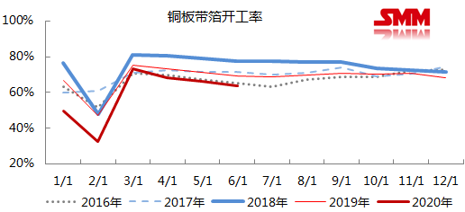 据SMM调研,5月份铜板带箔企业整体开工率为65.94%,同比下滑5.22个百分点,环比下滑2.37个百分点。5月开始铜板带箔行业订单减少,企业开工表现趋弱。根据调研反馈,其中来自下游电子板块消费较差,主因电子行业受华为等龙头受到制裁影响。另外,来自下游出口型企业的订单萎缩明显,主要包括门窗饰品、小家电等。不过来自5G基建与电力线缆的订单有一定增量,拉动了一部分铜板带箔消费。