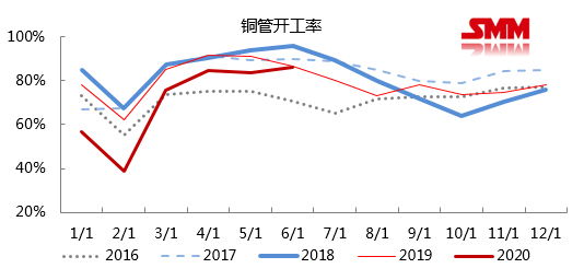 据SMM调研数据显示,5月份铜管企业开工率为83.39%,同比下降7.54个百分点,环比下降1.03个百分点。据SMM了解,5月铜管企业开工率同、环比均表现走弱,主因终端行业需求恢复有限,海外消费需求仍然笼罩早疫情的阴影之下,叠加国际贸易关系紧张的影响,5月份空调行业出口受损严重,导致整体空调产量受限,水暖卫浴行业因出口影响亦表现不佳,因此抑制了对铜管的消费。生产企业前期积压的订单已经消化完毕,所以本月开工率出现小幅回落。5月份的实际开工率还是要高于上月SMM对于5月铜管开工率的预期82.66%,部分企业反映自5月下旬开始订单情况有所改善,产量小幅增加,主要得益于家电行业内销数量的增长。(调研企业:19家,产能:215万吨)