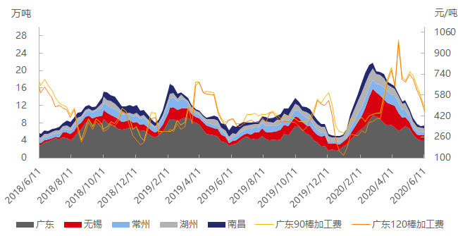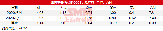 到货增加出库下滑 铝棒库存较上周四增加0.09万吨至7.40万吨。无锡、常州、南昌库存小增,佛山、湖州库存略降。