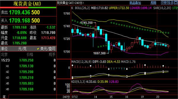 黄金日内下跌,很大几率延续走空破新低,日线上黄金实时价格再次跌破MA5均线,MA10均线阻力下移至1720一线,布林带下轨支撑下移至1672一线,若短周期不能上破1720阻力,便还有下跌的空间。4小时图形中布林带上下轨平行发展,区间暂定1719-1700,目前实时金价跌穿MA5MA10均线以及布林带中轨向下运行,随着美元指数反弹,黄金向下破位的概率逐步放大。附图指标上MACD红色柱即将衰竭,KDJ随机指标死叉,三轨向下延伸,STO指标同步下移,配合ZigZag抛物线转向指标给出顶部信号,综合来看今日行情上方关注1719-1732阻力,下方关注1700-1683支撑,操作上刘铭诚建议反弹做空为主。