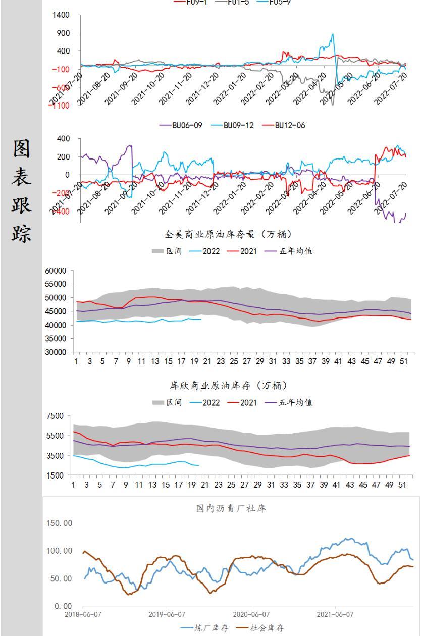截至7月20日,沥青西北现货价4000-4900元/吨;东北现货价4556-4806元/吨;华北现货价4200-4220元/吨;山东现货价4180-4300元/吨;华东现货价4540-4570元/吨;华南现货价4650-4700元/吨;西南现货价4700-4770元/吨。7月14日-7月20日,沥青装置平均开工率为47.39%,较上周开工率均值下跌0.75个百分点。虽然山东地区个别炼厂增产,并且西北地区的天之泽复产沥青,但由于华北地区的金承石化以及西北地区的塔河石化停产,整体带动了开工率出现下跌。7月7日-7月13日各类型炼厂沥青生产理论综合利润均值如下:江苏主营炼厂为-356.22元/吨,环比下滑1.92元/吨;山东综合型独立炼厂为152.43元/吨,环比上涨116.97元/吨;河北简单型独立炼厂为101.69元/吨,环比上涨108.20元/吨。库存端,截至7月20日,卓创数据显示,华南炼厂库容比环比增加3%至30%,华东炼厂库容比环比减少3%至17%,山东炼厂库容比环比增加1%至34%,东北炼厂库容比环比持平为25%。主要炼厂库容比环比持平为28%。主要地区社会库存比环比减少2%至32%。