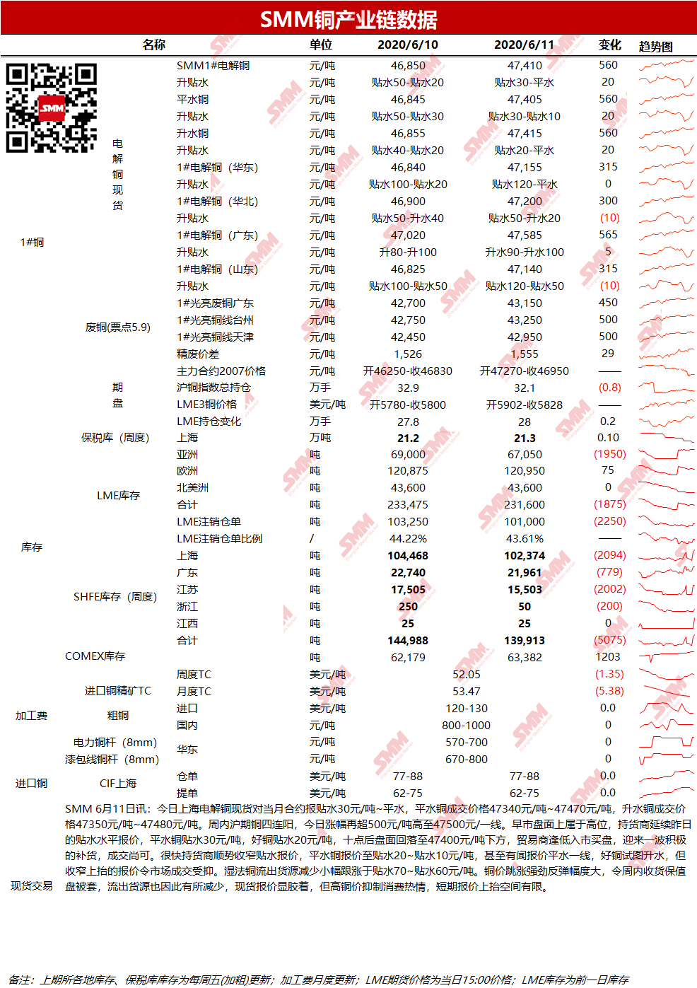 6月11LME铜库存环比减1875吨至231600吨;上期所铜仓单库存环比减726吨至42161吨。