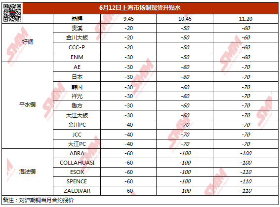 【SMM价格】6月12日上海市场铜现货升贴水(第三时段)