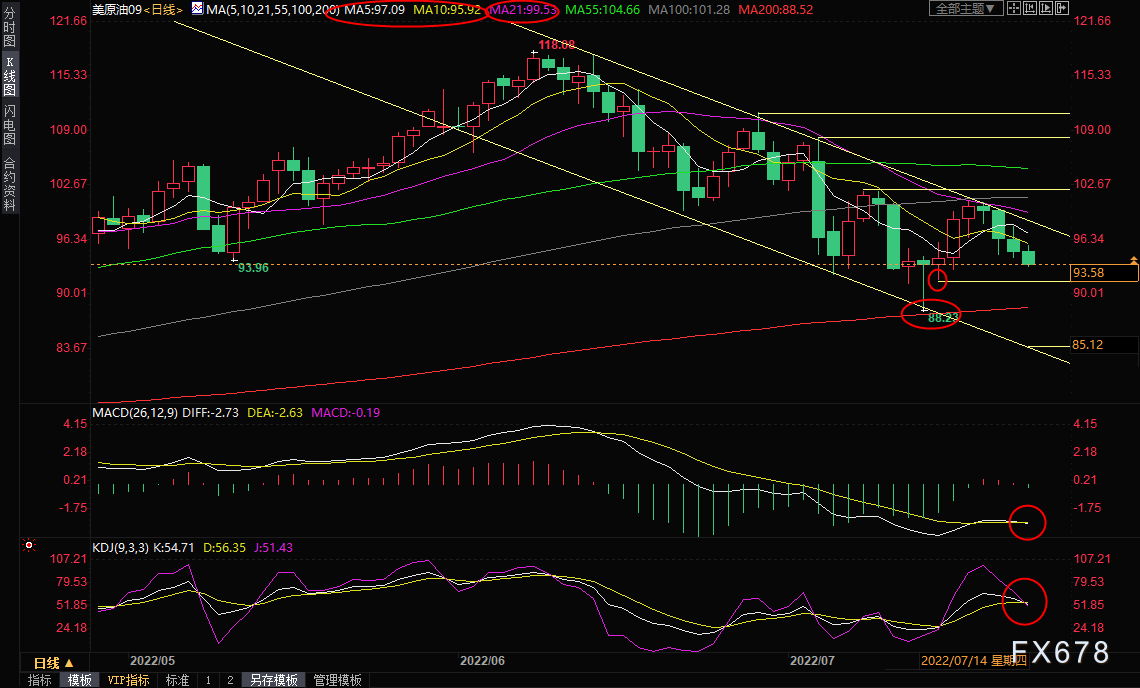 日线级别:震荡下跌;MACD金叉被破坏并初步死叉,KDJ初步死叉,短期均线空头排列,油价短线偏向空头,初步支撑在7月15日低点91.64附近,然后是90整数关口附近支撑,布林线下轨支撑目前也在该位置附近,短线油价试探该支撑的可能性较大,7月14日低点支撑在88.23附近,短线能否进一步下破还有待观察;中线目标可以参考下跌通道下轨支撑,目前大约在83.67附近。