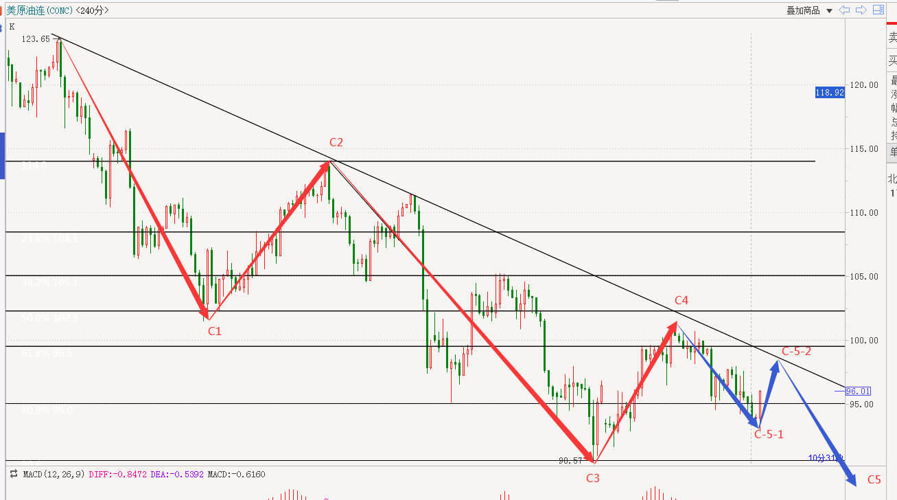 最近国际格局不稳定导致原油走势也是拉开幅度,经常会出现虚穿的诱导情况,但是整体的结构上还是如期进行。今天日内原油横盘整理,在欧盘时段空头率先发动攻击,但是受黄金分割的支撑只是虚假的破位就迎来了快速的反弹。目前来看,现在已经进入到C-5-2的反弹周期中。因此晚间原油操作建议94.70一线买入,风控94.20下方,目标97.10~98。按照图灵波浪交易系统的推演,目前大概率进入到C浪5下行结构中,细分到反弹的子浪2中,整体反弹先看以50%黄金分割处为首要目标。(博易大师报价,图灵波浪理论)图表为原油4小时图