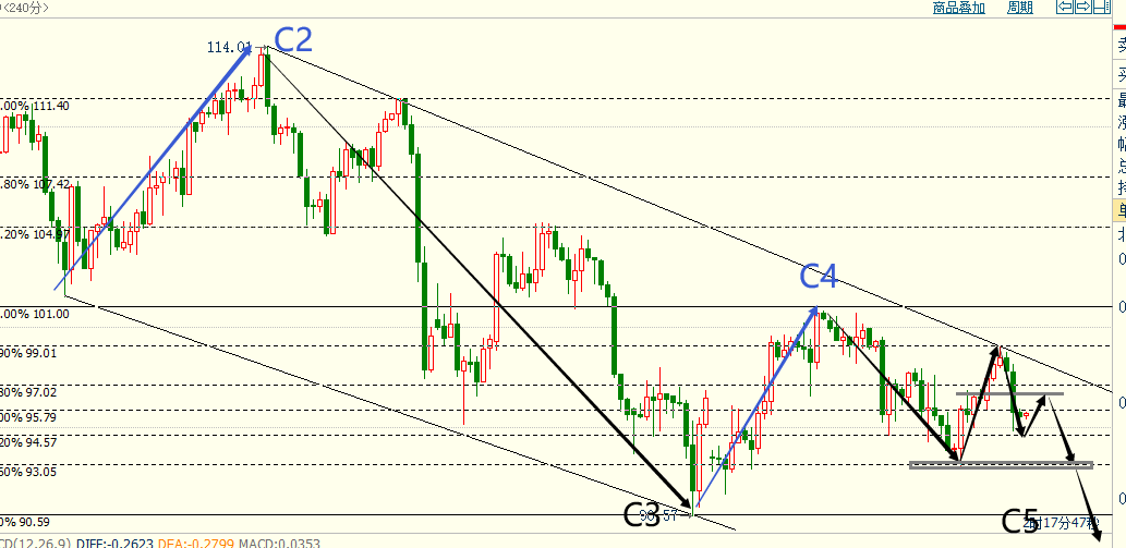 原油昨日按照看涨的思路在不断向上运行,直至晚间从99一线开始了大幅回落,日内的涨幅全部回吐殆尽,说明空头还是掌握了趋势的运行节奏,目前看下跌走势还未完成,因此今日将会延续昨日的空头转折继续下跌。今晚将会公布最新一期的EIA数据,目前市场预期是利多原油,可能对于走势来说也是下跌中途的一个反弹节奏,这点需要注意。原油操作建议反弹至96.75一线卖出,风控97.25上方,目标94.80~93.80~93。按照图灵波浪交易系统的推演,如果今日开始的下跌能跌破93的多空分水岭,则意味着短期的反弹走势结束,市场进入到了C浪5-3的主跌阶段,否则短期将会延续区间震荡走势。(博易大师报价,图灵波浪理论)图表为原油4小时图