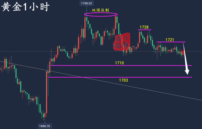 黄金1680这波反弹受阻1735一线双顶压制,昨日在618压力位1728形成小双顶回落,美盘震荡收盘,日线十字K。