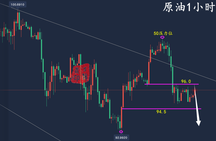 原油在大空趋势下反弹受阻转跌,昨日刚好到达50%压力位,欧美盘连阴大跌,日线收阴,形成连阴单阳格局,短线看空头延续。今日原油关注96—96.3一线压力可空,下方支撑看94.5—93.0!