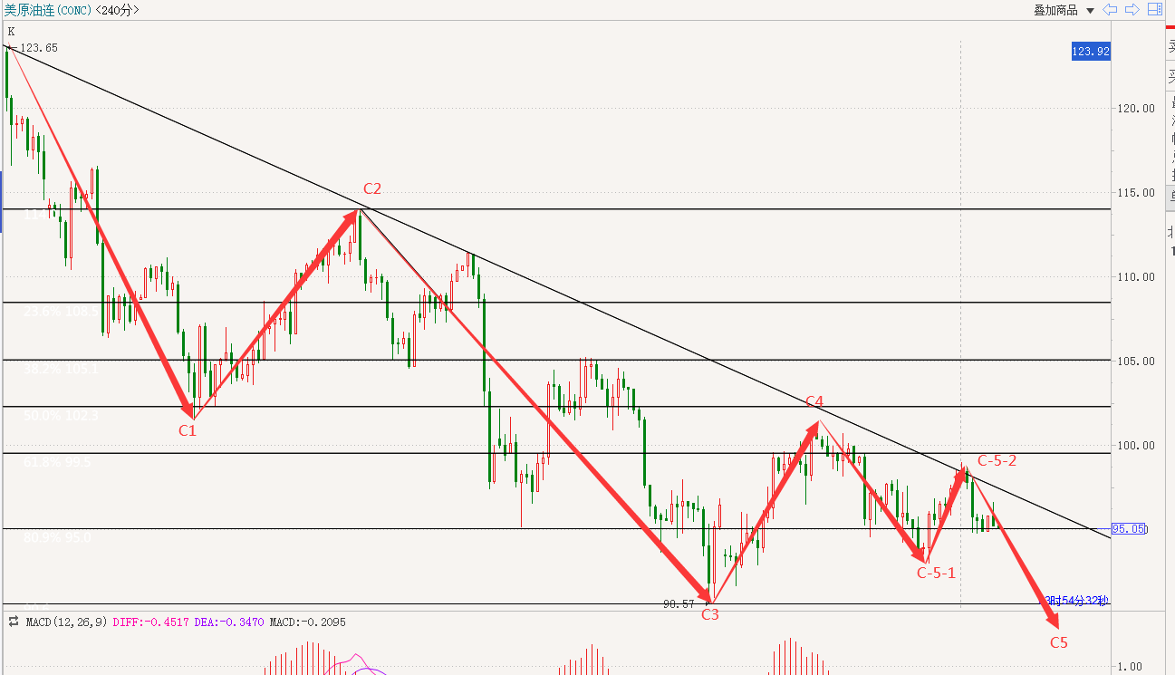 原油昨日在趋势线和黄金分割双重压制下空头最终胜出,空头的暴力下行给予C浪5的跌势无疑了奠定了基础。昨日的暴跌也是在换来了短期的休整,今天日内以小三波结构反弹到38.2%黄金分割处受阻,但是并未展开破底走势,今晚将会公布EIA数据目前市场预期是利多原油,此处或许会再次形成震荡格局,但是整体的跌势还是保持不变,因此晚间原油操作建议反弹至96.00一线卖出,风控96.50上方,目标94.20~93。按照图灵波浪交易系统的推演,目前大概率已然处于下跌C-5-3中,整体跌势相对比较利索,所以反弹卖出是最好的选择。(博易大师报价,图灵波浪理论)图表为原油4小时图