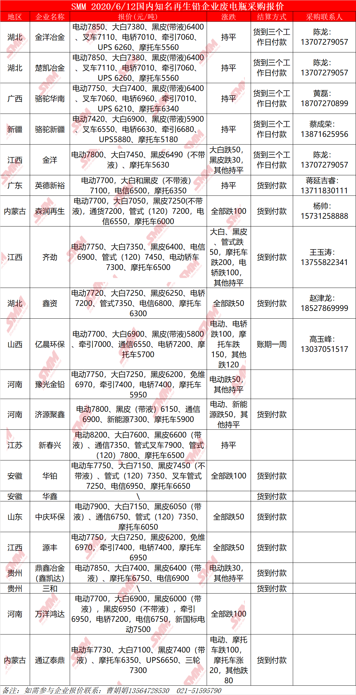 6月12日SMM国内知名再生铅企业废电瓶采购报价