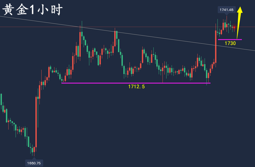 在之前的分析中锦晟强调过,1680一波反弹提前走出,75个基点加息落地后的反弹幅度和力度有限,所以凌晨这波行情关键看延续性。一般在强势行情中高位横盘可以直接多,但是目前黄金走势而言,并不能看强势,上方面临密集压力位1740—1745—1752,只能看震荡多。