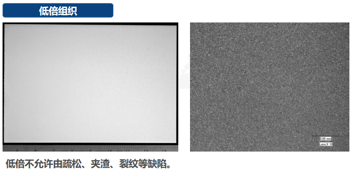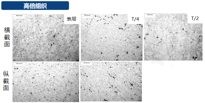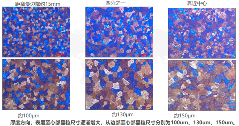 取样要求\化学成分\氢含量\渣含量\低倍组织(低倍不允许由疏松、夹渣、裂纹等缺陷。)\高倍组织\微观偏析(厚度方向,表层至心部晶粒尺寸逐渐增大,从边部至心部晶粒尺寸分别为100um、130um、150um。)\铸锭荧光渗透检测( FPI )