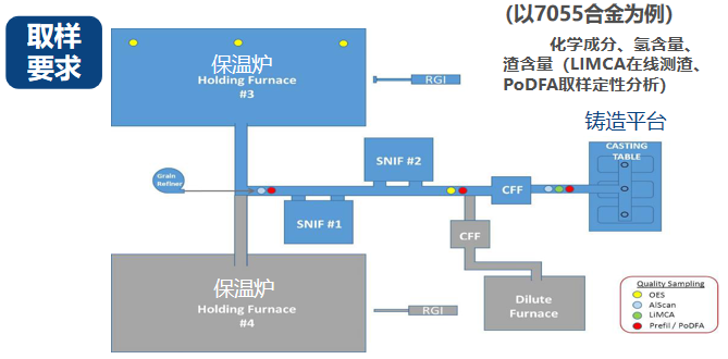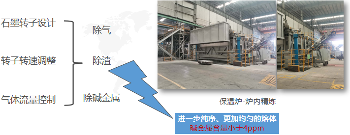 熔炼温度:不超过750℃,防止尖晶石的产生;严格控制加合金温度,尤其是加Mg及加Zr温度;熔炼过程中配备电磁搅拌保证熔体均匀性;控制装炉量与精炼工艺(转子转速、氯气比例)的匹配,保证良好的精炼效果且不生产过多的氯化物。