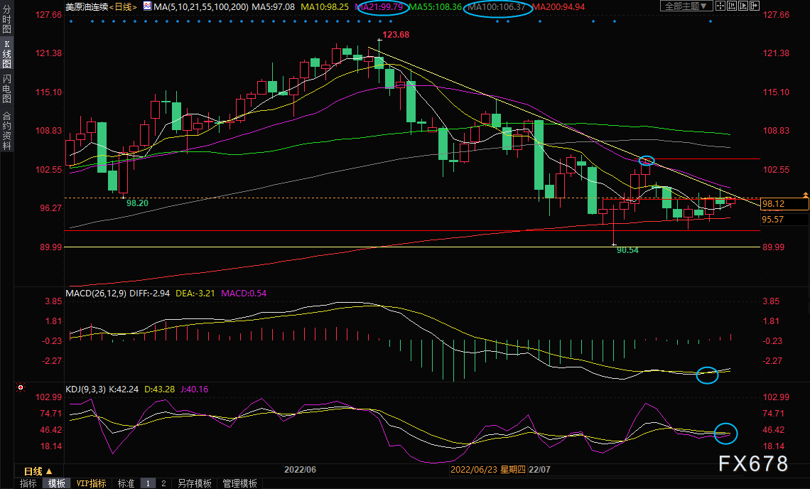 日线级别:震荡;MACD轻微金叉,KDJ死叉被破坏,200日均线给油价提供良好支撑,失守200日均线94.94前,短线油价偏向震荡上涨,初步阻力在21日均线99.79附近,也可以参考100整数关口,进一步阻力在布林线中轨101.54附近,若能顶破该阻力,则增加短线看涨信号;然后是7月19日高点104.43附近阻力,强阻力在100日均线106.37附近。