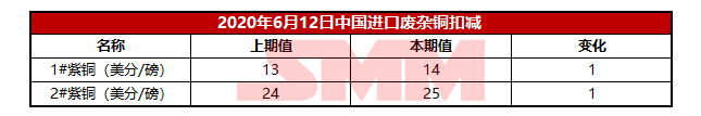 【SMM价格】 2020年6月12日中国进口废杂铜扣减