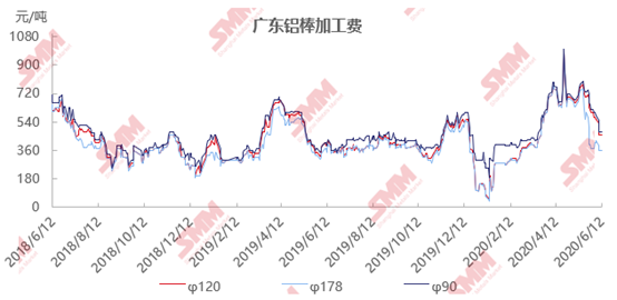 本周广东铝棒加工费跌势不改,价格重心继续下移。其中φ90规格铝棒加工费在460-570元/吨,φ120规格铝棒加工费在440-550元/吨,φ178规格铝棒加工费在340-410元/吨。小棒加工费环比上周下跌百元,但仍高于去年同期,大棒价格低位调整,大小棒价差收窄至100元/吨附近。