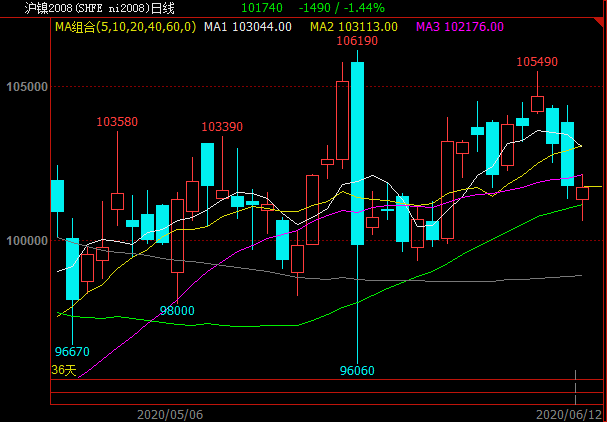 SMM6月12日讯:本周沪镍从前一周涨幅中回落,周二一度涨至105490元/吨,为5月22日以来高点,但随后不断下挫,截止周五日间收盘,沪镍主力合约2008报收101740元/吨,基本吐出上周涨幅。不锈钢方面期价也同样走势不佳,延续跌至本周继续下挫,截止周五日间收盘,报收12765元/吨。