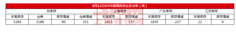 6月12日SHFE锡周度库存及仓单