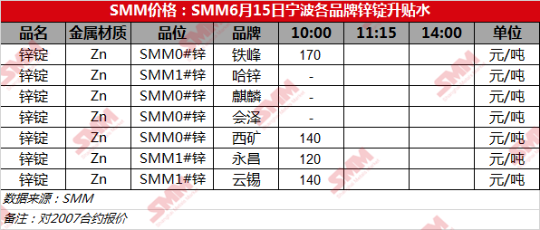 SMM6月15日SMM0#锌宁波各品牌升贴水