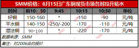 【SMM价格】6月15日广东铜现货市场各时段升贴水(第三时段)