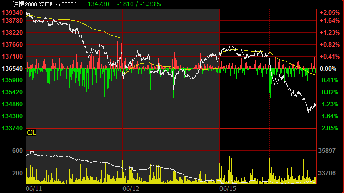 SMM6月15日讯:今日沪期锡低开低走,截止日间收盘,沪锡主力合约2008报134730元/吨,跌幅达1.3%,盘中一度跌至134460元/吨,吐出自6月5日以来全部涨幅,基本回落至三月间震荡一线。