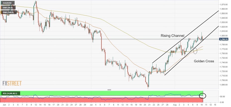 值得注意的是,50周期指数移动均线(EMA)在1768.90美元/盎司处上穿200周期EMA,形成技术面上的“黄金交叉”,增加了金价的上行风险。