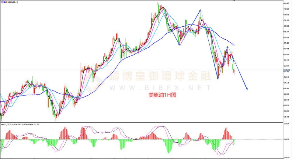 美原油上周五整体波动较小,全天维持窄幅震荡,今日早间跳空低开,目前来到35.00附近。从1H周期走势结构看,原油自40.35附近下跌,以3波下跌结构跌至34.66附近,随后企稳上行,但并未改变下跌趋势,那么自34.66附近的上涨行情可看做4浪反弹,后市大概率还有5浪下跌。结合MACD指标来看,DIFF线与DEA线零轴下方二次死叉,这种形态表明空头力量较强,日内操作可在原油反弹至35.60附近尝试空单,目标34.50附近。