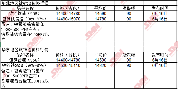 SMM 6月16日讯:今日镀锌渣主要含量含税报价如下:(单位:元/吨)