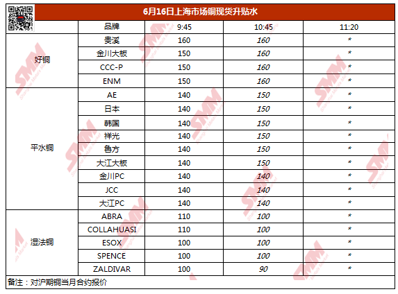 【SMM价格】6月16日上海市场铜现货升贴水(第二时段)