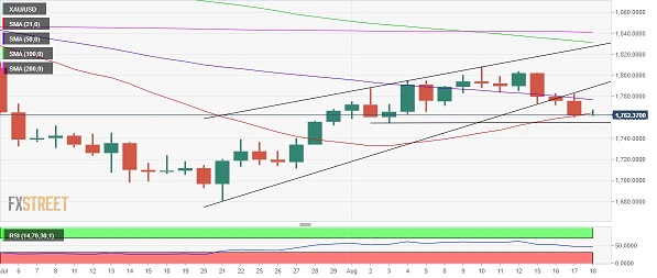 Mehta称,从日线图来看,金价在跌破上升楔形后,周三挑战21日均线支撑。周四交易迄今,金价已经跌破21日均线(目前在1764美元/盎司),预计会进一步下跌。