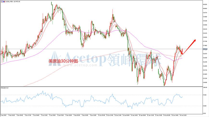 从上图美原油30分钟周期走势图来看,美原油目前处于强势反弹之中,从均线来看,目前美原油快速下跌至34.7后走出强势反弹,K线已经突破了MA5,MA10,MA60,MA200,且在今天早间回踩MA60,MA200再度向上,处于多头加速向上的行情。但从RSI指标来看,指标价格进入了超买区域回落,并有二度进入超买区域的迹象,建议美原油以多头思路对待。