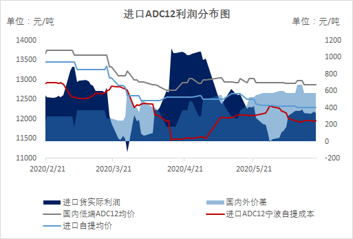 注:进口自提为宁波港ADC12现金自提价格,利润是以当前海外报价均价与国内到岸现货价格均价对比,实际因到货存在船期因素,与实际成交利润略有差异,SMM正在尝试修正。