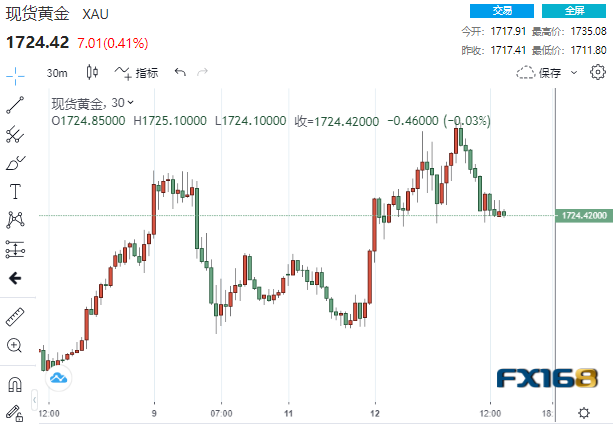 美市尾盘,现货黄金收报1724.42美元/盎司,上涨7.01美元或0.41%,日内触及8月30日以来的最高水平1735.08美元/盎司,最低触及1711.80美元/盎司。