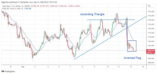 Dua表示,从小时图来看,金价在跌破三角形后大幅下跌。这一形态的向上倾斜趋势线始于上周低点1691.46美元/盎司,水平阻力位在上周四高点1728.24美元/盎司。金价目前正形成一个倒旗形,面临进一步急剧下滑的风险。