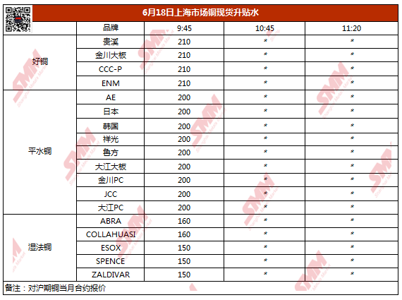 【SMM价格】6月18日上海市场铜现货升贴水(第一时段)