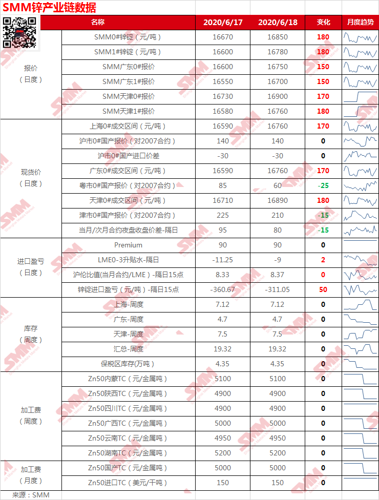 数据包括:锌现货报价、进口盈亏、库存、加工费