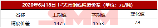 【SMM 数据】2020年6月18日1#光亮铜线精废价差